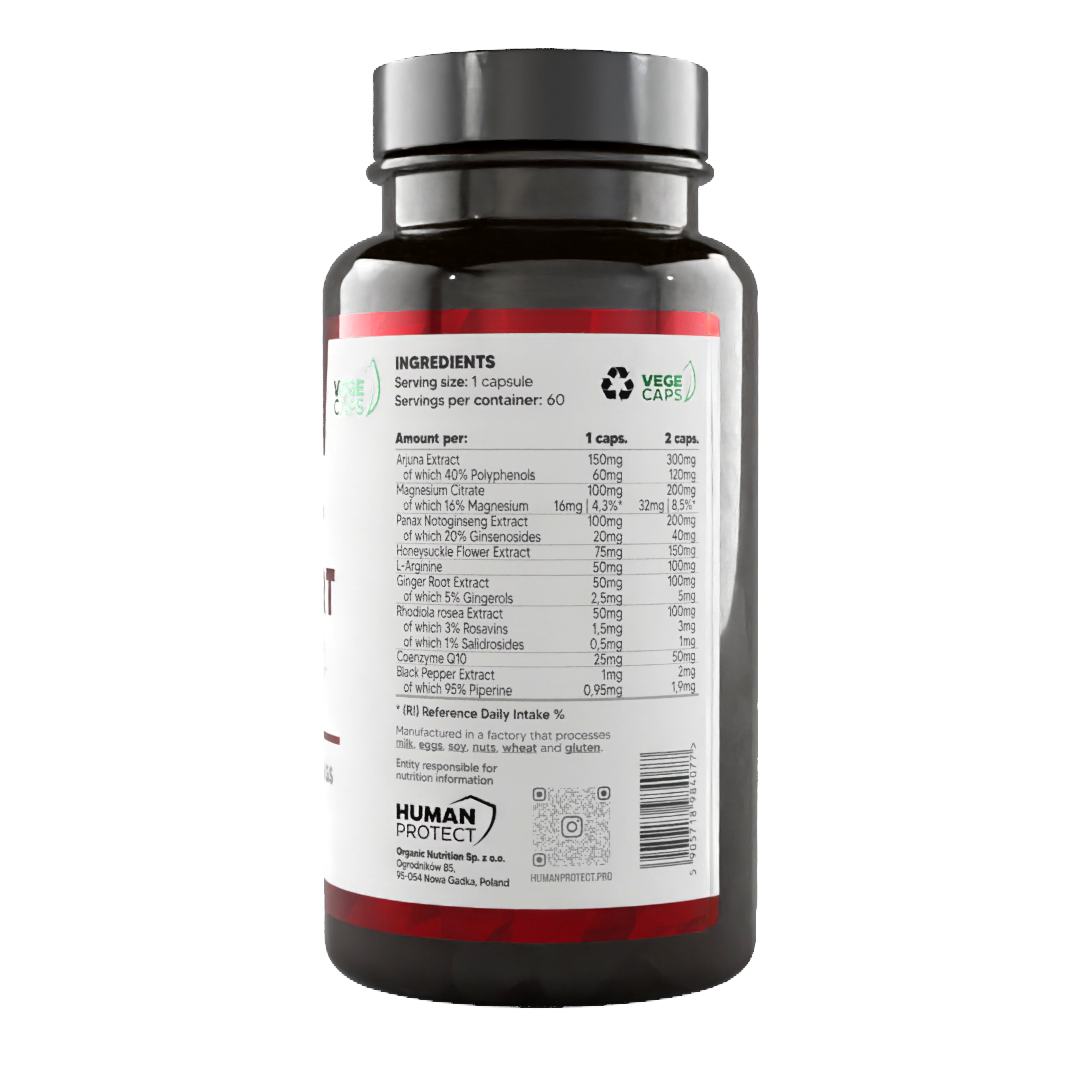 Es handelt sich um eine umfassende Formel aus hochstandardisierten Inhaltsstoffen zur Unterstützung der Arbeit Ihres Herz-Kreislauf-Systems. Es handelt sich um ein Präparat, das unter anderem aus Arjuna ( Terminalia arjuna ) mit hoher Standardisierung von Polyphenolen (40 %), chinesischem Ginseng ( Panax Notoginseng ), standardisiert auf bis zu 20 % Ginsenoside, Magnesiumcitrat mit 16 % Magnesiumgehalt, Coenzym Q10 und 4 weiteren hochstandardisierten und aktiven Inhaltsstoffen besteht.
