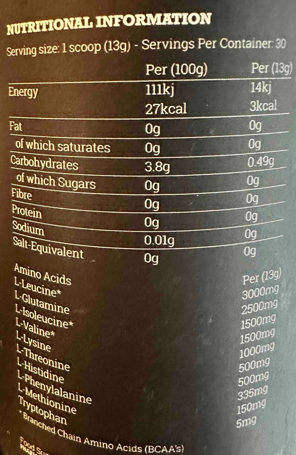 - Verzweigtkettige Aminosäuren (BCAAs) : 6 g pro Portion im optimalen Verhältnis 2:1:1 (3000 mg L-Leucin, 1500 mg L-Isoleucin, 1500 mg L-Valin).