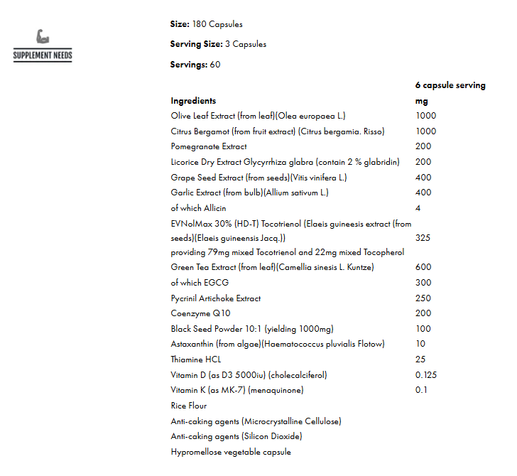 Formulated by Dr Dean St Mart PhD using a host of antioxidant ingredients such as EvNolMax full spectrum tocotrienol/ tocopherol Vitamin E complex, Pycrinil trademarked artichoke extract, Citrus Bergamot, Licorice Dry Extract, Black Seed Powder, Garlic Extract (Allicin), Olive Leaf Extract, Pomegranate Extract, Green Tea Extract, Co-Enzyme Q10, Astaxanthin, Vitamin D3 and K2, and Thiamine HCl.